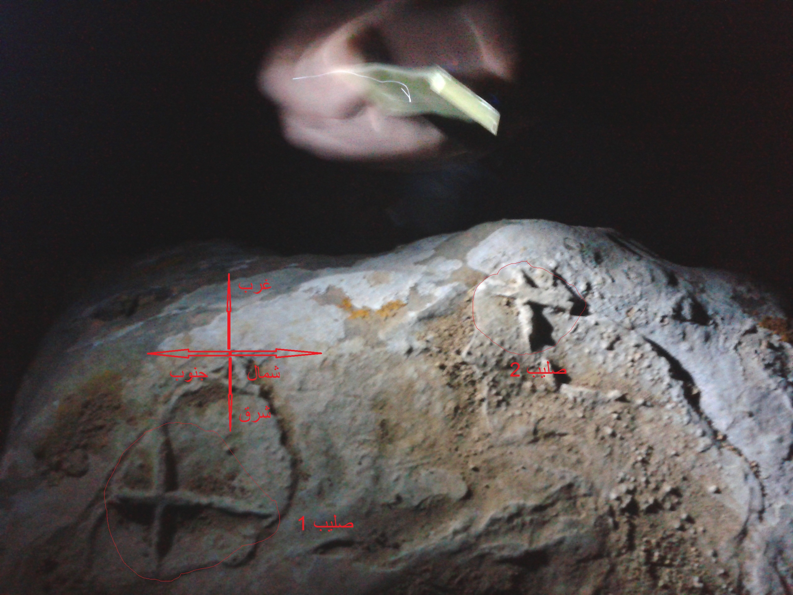 أيّه الأحبّة عثرة على صخرة فيها صليب كبير متّجه من الجنوب إلى الشّمال و على يساره صليب أصغر منه متّجه من الغرب إلى الشّرق و هذه صورة توضيحية :