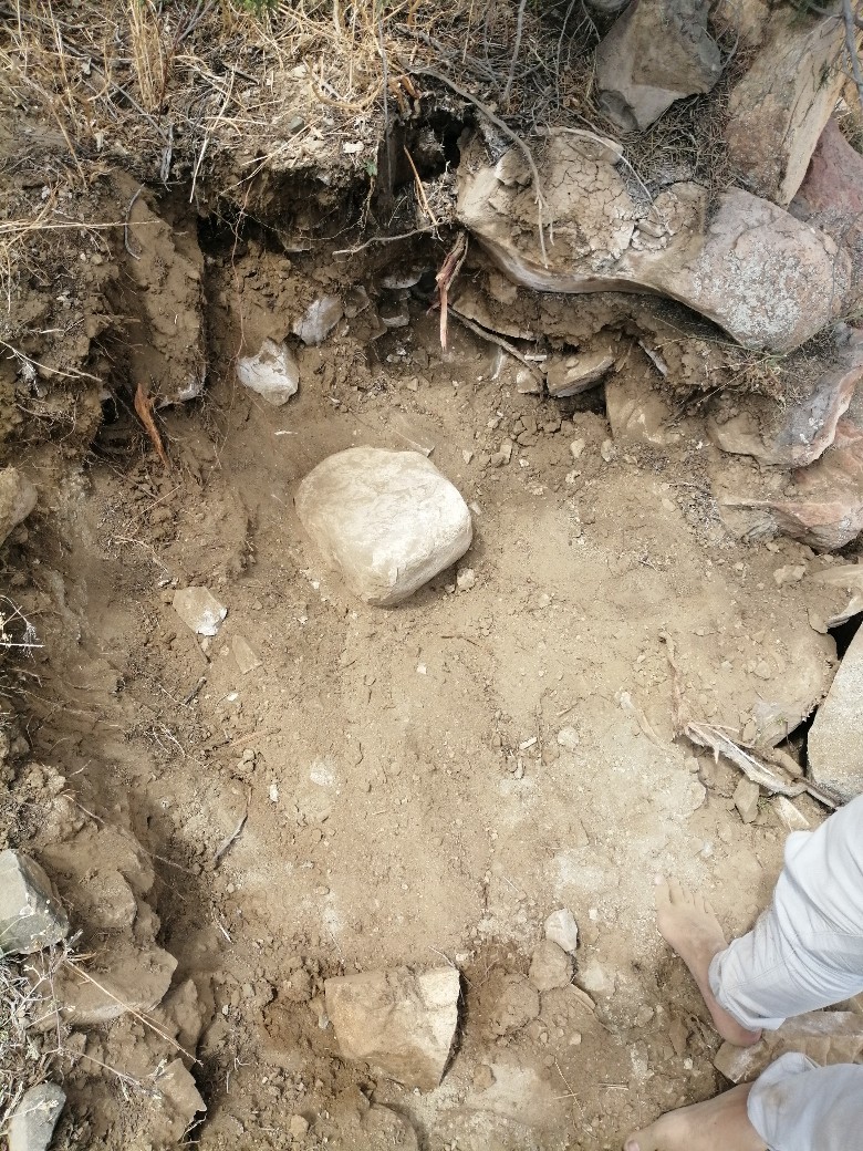 الموقع به دفين ناس اتت وحفرت لمسافة ثلاث متر حفرو الصخر اربع حفر لم يجدو شيئ. في الجبل المقابل.