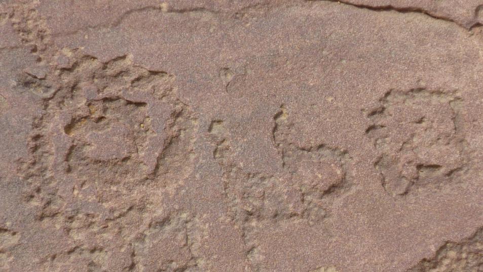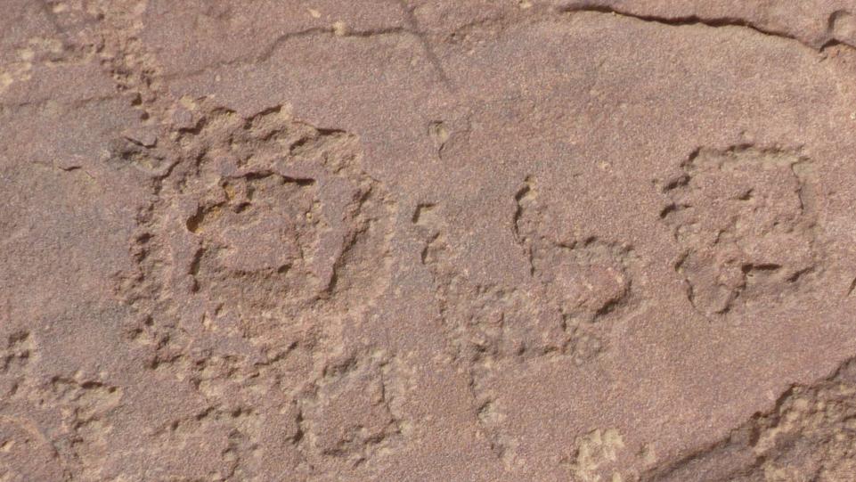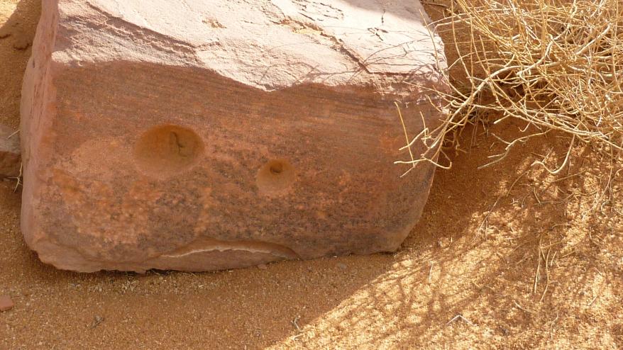 الموقع عبارة عن دائرة من الاحجار وقطر الدائرة تقريبا عشرة متر مساوية للارض وكان الحجر الموجود به الجرون والنقوش منتصب وكانه شاهد قبر وطوله تقريبا متر ونصف وكانت الجرون للاعلى والصورة تغني عن الشرح.... جميع الصور في مكان واحد