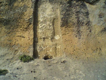 يوجد نقش على جبل من الصخر لامرأة واقفة طولها 1.20 متر (رومان) تنظر الى الامام .يداها الى الاسفل و بين الساقين يوجد جرن قطره 25 صنم وعمقه 10 سم هذه الصورة تتوسط الجبل