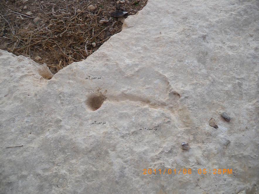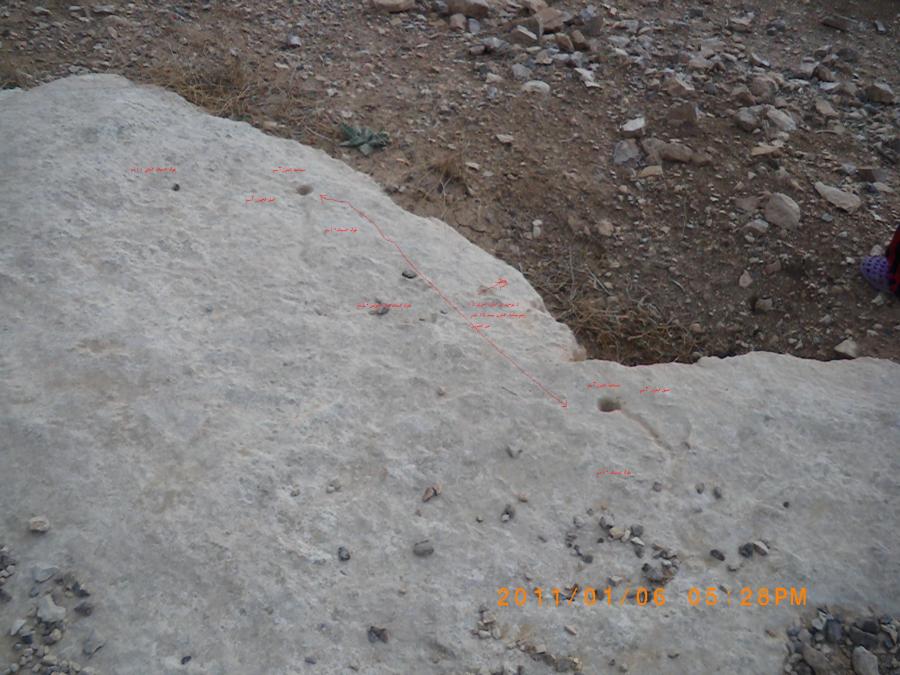 جرنين متقابلين قطر كلاهما 3سم وعمقهم2سم المسافة بينهم40 سم الجرن الاول يوجد سيال واحد طوله10سم والجرن الثاني يوجد سيالان واحد طوله 11سم والثاني طوله10سم لا يوجد على السخرة اي اشارة اخرى ويوجد على بعد 15قدم من الجرون من جهة الغرب رجم من الرمال والحجارة مساحة الرجم4م/4م وارتفاعه5م