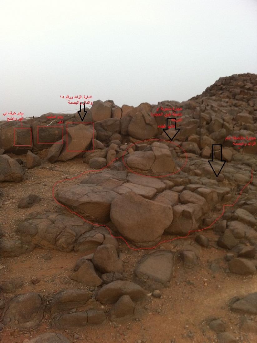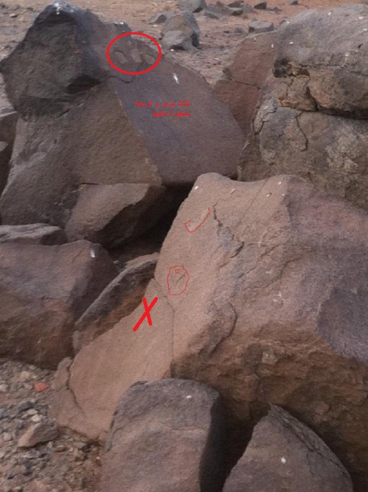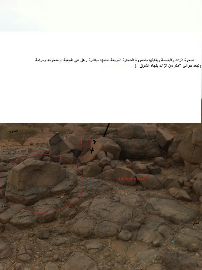 الحجارة المربعة ياطويل العمر امام الزائد من جهة الشرق على بعد 1متر فقط من الزائد والبصمة .ولم اجد بصمة اخرى او جرن او غيره على هذه الحجارة المربعة ( وحفرة الصخرة الي فوق الصخور المربعة وطلعتها على جنب وطلعت بكل سهولة ليست ملتصقة بالحجارة الاخرى وحفرت تحتها 30سم الارض عادية وماكملت قلت ياولد ماهو معقول بيحطون دفين امام الإشارة ويحطون فوقه شي واضح جدا ومميز . ولم اكمل الحفر لبقية الحجارة المربعة . اما بالنسبة للصخرة الدائرية الثانية فهي الوحيدة التي تبعد عن الإشارات 15م بتجاه الجنوب الشرقي . ومدفونه بالآرض فقط جرء منها واضح . ولم احفرها .