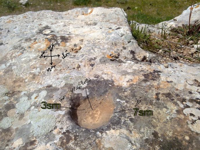 اخوي هذا جرن قطره 7 سم وعمقه 3 سم وفي منصفه بصمه بتجاه الشمال الغربي