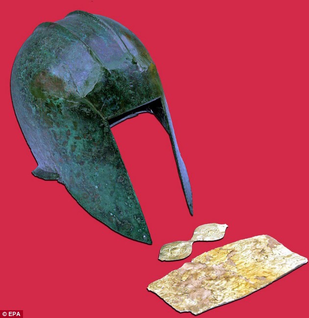 فرض: تم العثور على خوذة برونزية تحمل لوحات الوجه الذهبي (يسار) وخوذة النحاس والذهب العين غطاء اثنين من المحاربين القدماء في مقبرة في مدينة بيلا