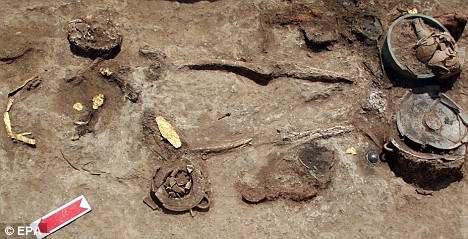 تم دفن بعض من المحاربين وهم يرتدون خوذات برونزية الى جانب سيوف وسكاكين حديدية.