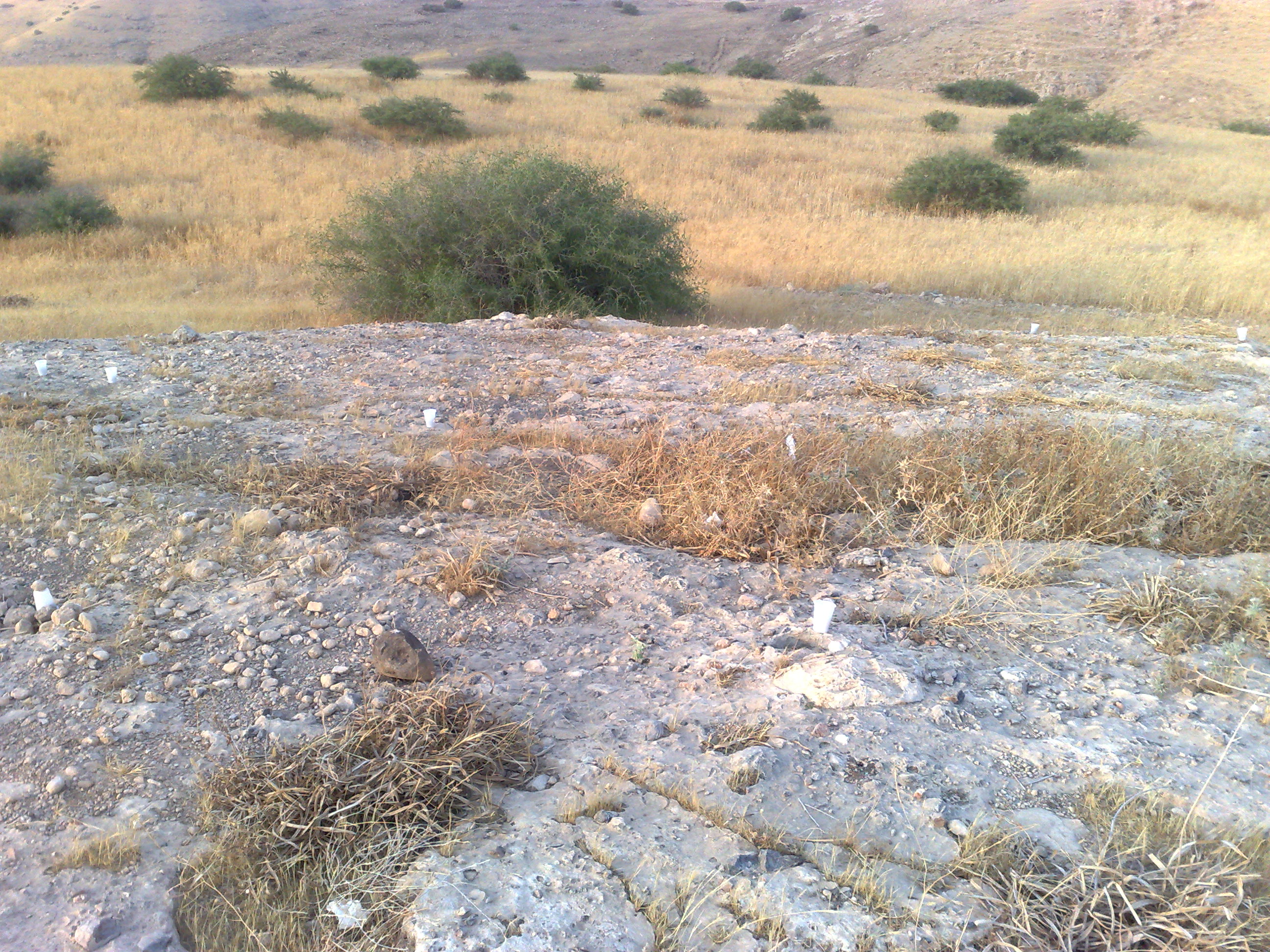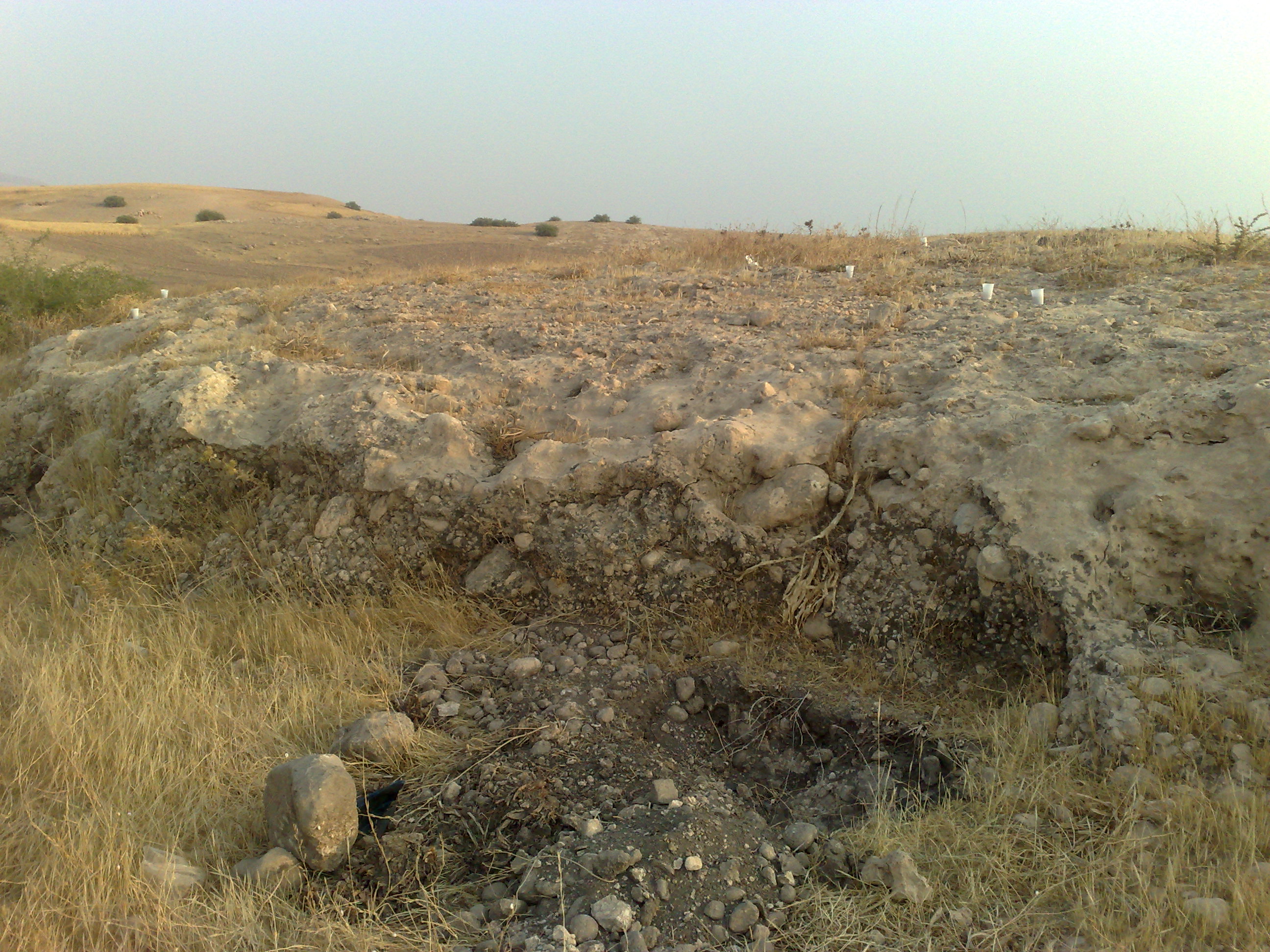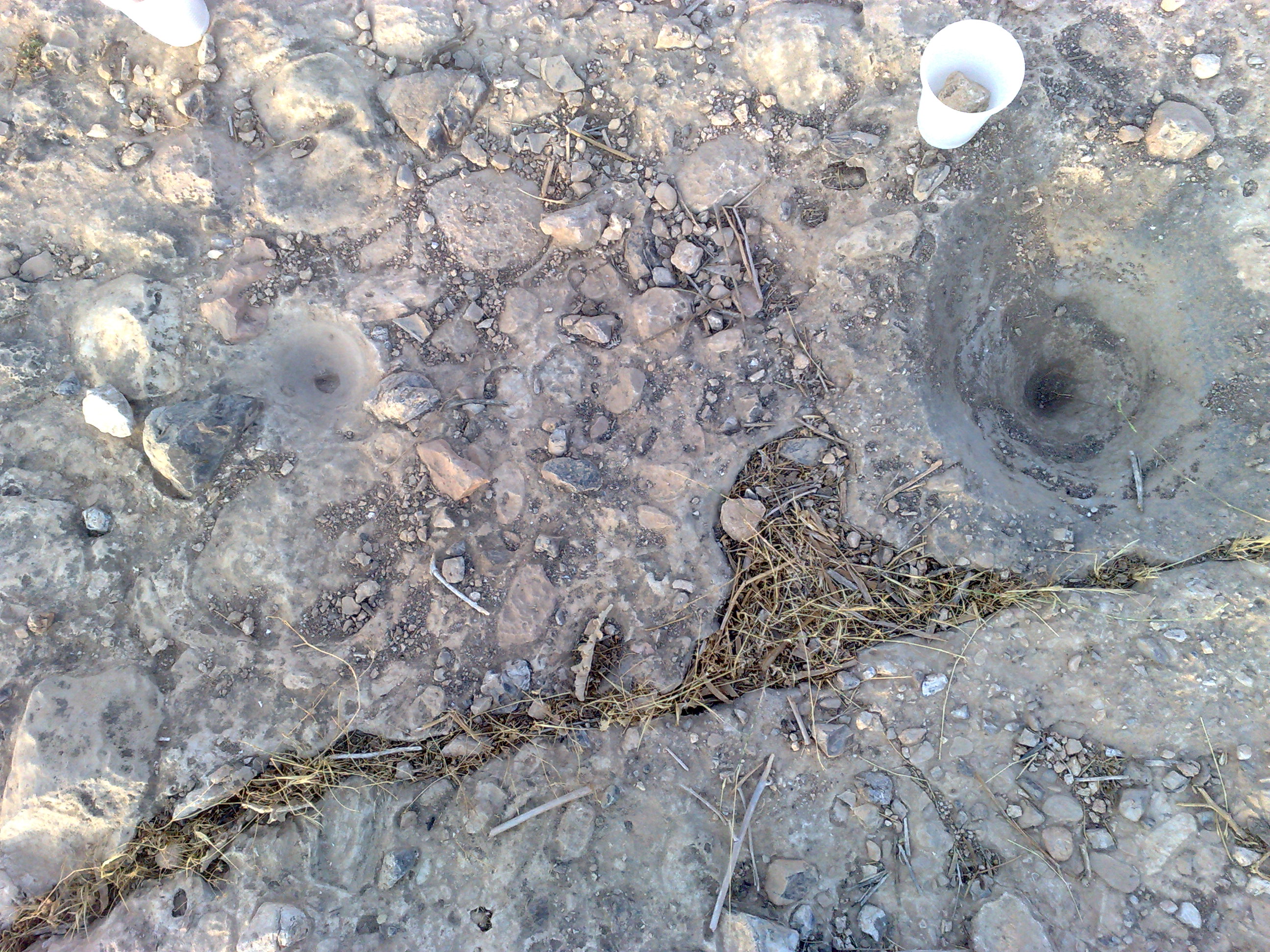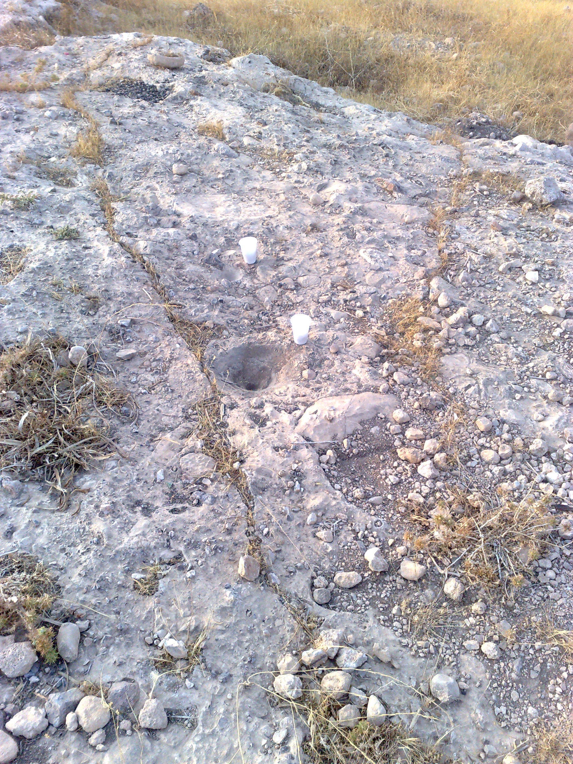السلام عليكم وبعد الصوره الاولى هي منضر الموقع من مكان الانحدار وكما هو مبين الجرون فوق الصخره والذي يدل على مكان الجرون هو كسات من البلاستك البيض علما ان ارتفاع الانحدار عن سطح الارض ما يقارب المتر و20سم .... الصوره الثانيه تدل على الجرن الكبير وجنبه الجرن الصغير...الصوره الثالثه تدل على وجودالجرن الكبير والصغير مع السيالات من يمين وشمال الجرون وهي نفس الصوره الثانيه لاكن من مكان ابعد من اجل السيالات وهي تاتي على شمال المكان وجنب الانحدار ....الصوره الرابعه تدل على سطح الموقع من جهة الجنوب والذي يدل على الجرون والمسافات من بينها ومكانها فوق الصخره والذي يحدد مكان الجرون هي الكسات البيض وهي سبع كسات اي سبع جرون علما بان شكل الصخره من جهة الجنوب الغربي مسح مع سطح الارض والقبور تاتي من نفس الاتجاه على بعد 25متر تقريبا الرجاء المساعده من اخواني الكرام في حل هذا الموقع وكيفية الوصول الى باب المغاره وعلى ماذا يدل الجرن الصغير ..والسلام خير ختام والله ولي التوفيق وشكرا..
