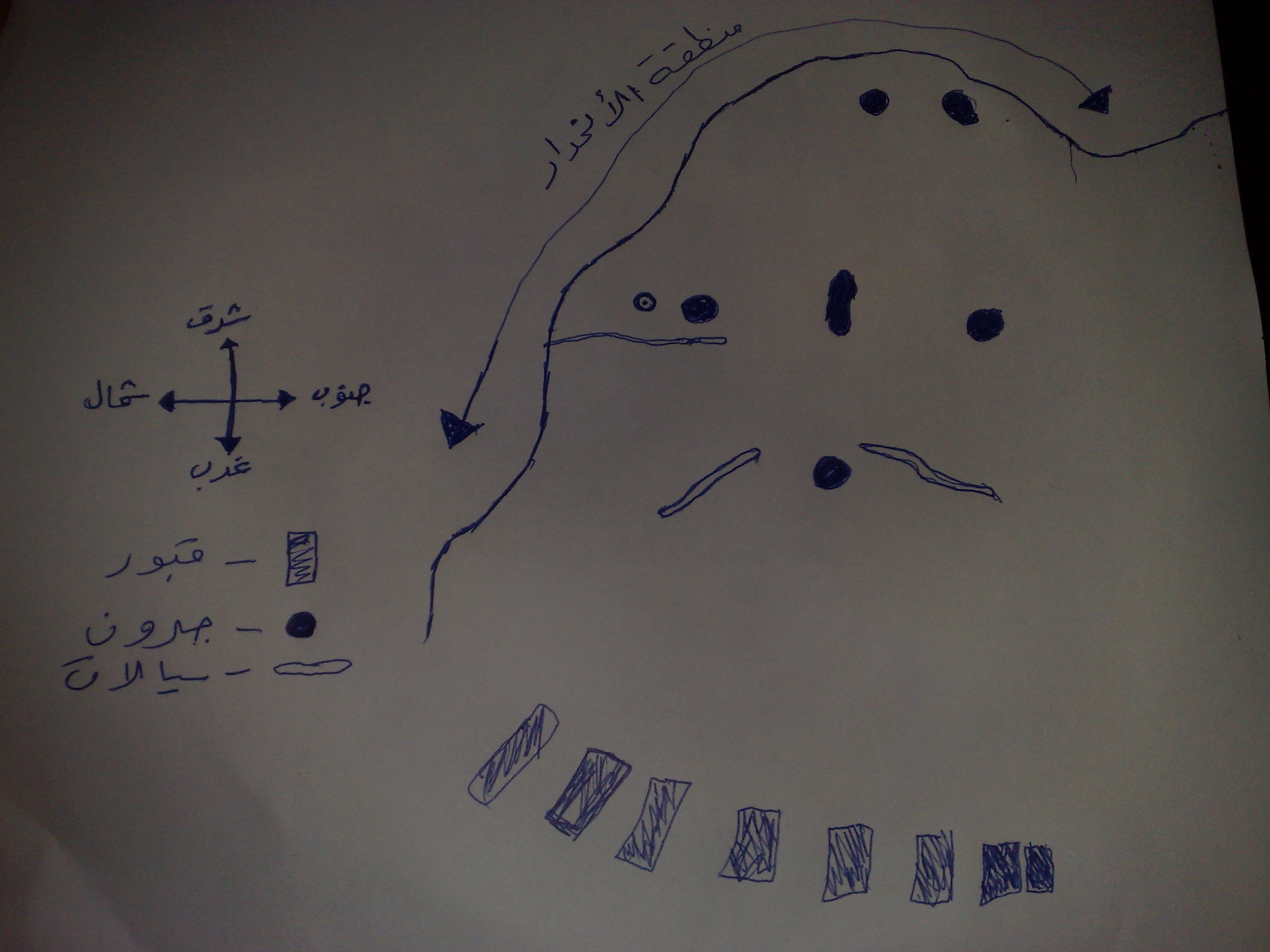 السلام عليكم ورحمه الله وبركاته وبعد......انا حابب اعرف حل الموضوع الجرون السبع التي تاتي فوق صخره على شكل المثلث فوق جبل كما ان هنالك جرن صغير في داخله شكل بلوره الذي ياتي على جنوب المثلث وهو صغير الحجم كما ان الصخره من جهة الشمال والغرب تاتي على مستوى الارض بينما من جهة الشرق والجنوب تاتي على انحدار ذو انخفاض ما يقارب المترالى المتر وعشرون سم كما ان هنالك ما يقارب 8قبور بجانب الموقع من جهة الغرب ...علما ان الجرن الصعير ياتي بحجم فنجن القهوه ويحرج منه سيالات 2الاول يبداء من الجرن الصغير باتجاه الشمال حتى نهاية الصخره والاخر يبعد عن الجرن الصغير 30سم تقريبا باتجاه الشمال حتى نهاية الصخره والاثنان ياتيات على شكل مثلث ووجود سيالات متفرقه على نفس الصخره ...وذالك يبينه الرسم الكيروكي المرفق واعتذر عن مقدرتي بارفاق الصور المبينه لذالك وذالك يعتمد على طبيعة عملي كونه يبتعد عن الموقع مسافه بعيده ولااستطيع الوصول اليه في الوقت الحالي لمدة اسبوع على الاقل وراجيا من الله ومنكم حلها في الرسم الكيروكي لحين ذالك