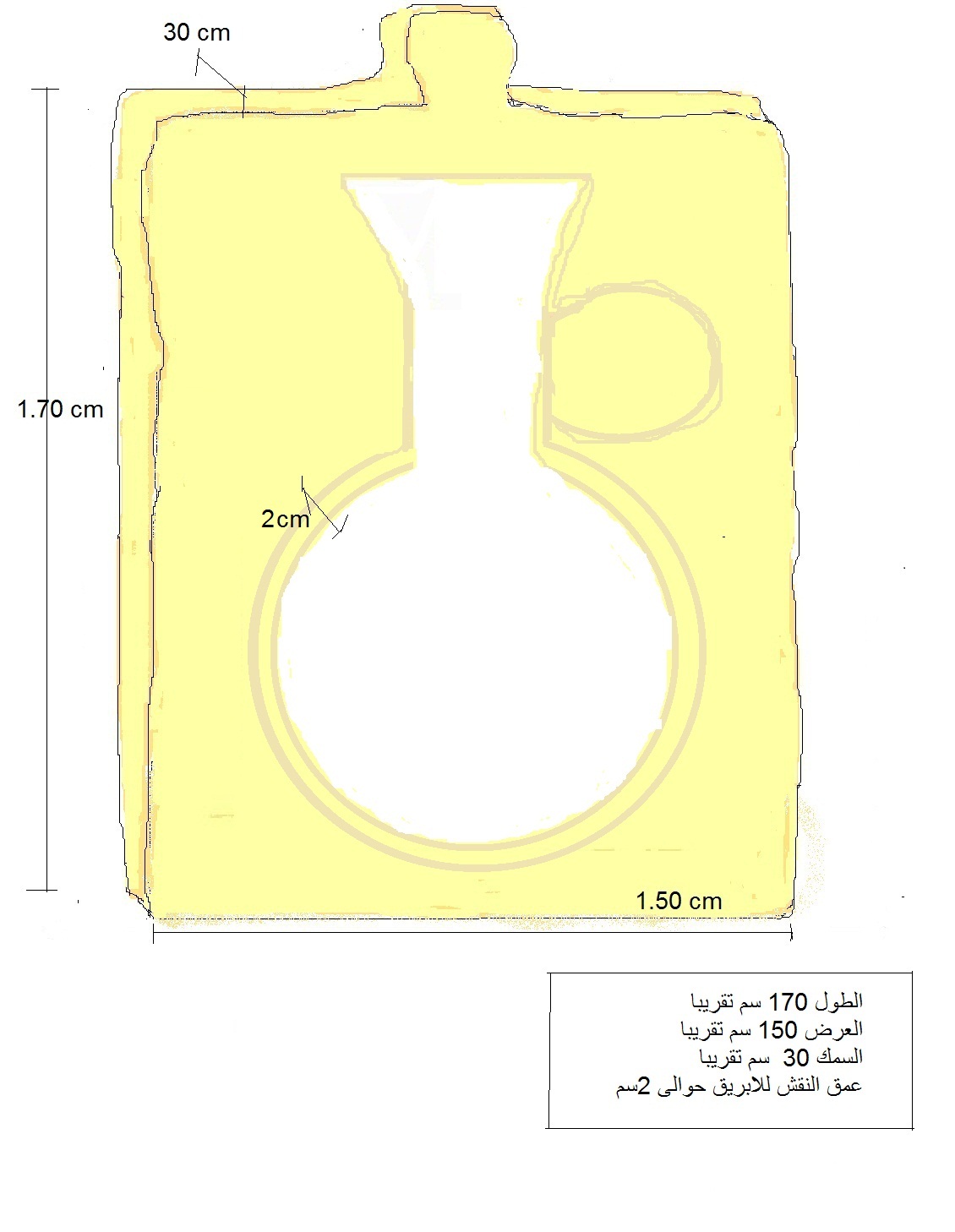 السلام عليكم ورحمة الله وبركاته اخوتى الأعزاء أرجو افادتى حول هذا الموضوع المهم جدا صخرة بطول حوالي 170سم وسمك 30 سم وعرض 150 سم و هي منحوته بشكل جميل وفى وسطها يوجد نقش على هيئة إبريق لونه ابيض و الصخرة لونها مال الى الاصفرار و على ما يبدو أن الإبريق قد تم طلية بمادة الجبس أو الرخام ولكن بسبب عوامل التعرية لم يتبقى من هذه المادة التي تم استخدامها في طلي الإبريق إلا القليل وبالقرب من هذه الصخرة يوجد العديد من الصخور الآخرة و هي ذات إشكال مختلفة منها المربع ومنها المثلث وكل هذه الصخور مغمورة تحت التراب و لكن ليس بالكامل اى نصفها فوق الأرض و النصف الأخر تحت الأرض ولكن لا يوجد اى رسم أو نقش أو كتابة أو حفر على الصخور الآخرة ولكن الغريب انه عندما تقوم بالطرق على الأرض المحيطة بمكان وجود الصخرة تشعر أن هناك فراغ تحتك ولكن لا تستطيع تحديد مكانه بضبط .ولكن الغريب في هذا المكان الذي نستطيع أن نقول انه خالي من السكن تقريبا الغريب انه يقول عنه انه مسكون وانا اقسم بالله الواحد الأحد أنى رأيت ما يجعل جسم الإنسان يقشعر من الرعب و أن هناك شهادات من اشخص آخرين أنهم سمع اشخاص ينادونهم بأسمائهم او راو أشياء في هذا المكان. مكان الصخرة: ارض رملية و لااثر لي اى جبال قريبه منها .كيف كانت الصخرة عندما وجدت : كان نصفها الأعلى تحت التراب و نصفها السفلى فوق التراب .ولانى لم أتمكن من التقاط اى صور لي هذه الصخرة فقررت أن أقوم برسم هذه الصخرة في الرسم التوضيحي التالي ولانى لم أتمكن من التقاط اى صور لي هذه الصخرة لان هناك من قام بتكسيرها اعتقد منه أنها السبب في جعل ذلك المكان مسكون فقررت أن أقوم برسم هذه الصخرة في الرسم التوضيحي التالي مع العلم ان القيسات كلها تقريبا افيدونى جزأكم الله عنى كل خير و السلام عليكم ورحمة الله