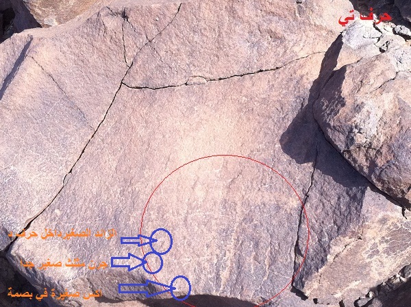 الحجر اللي فوق الاشاره مباشره ويشير الى القبله عليه جرنين صغيره وعلامتين اكس مختلفه موجوده في صورة اخرى