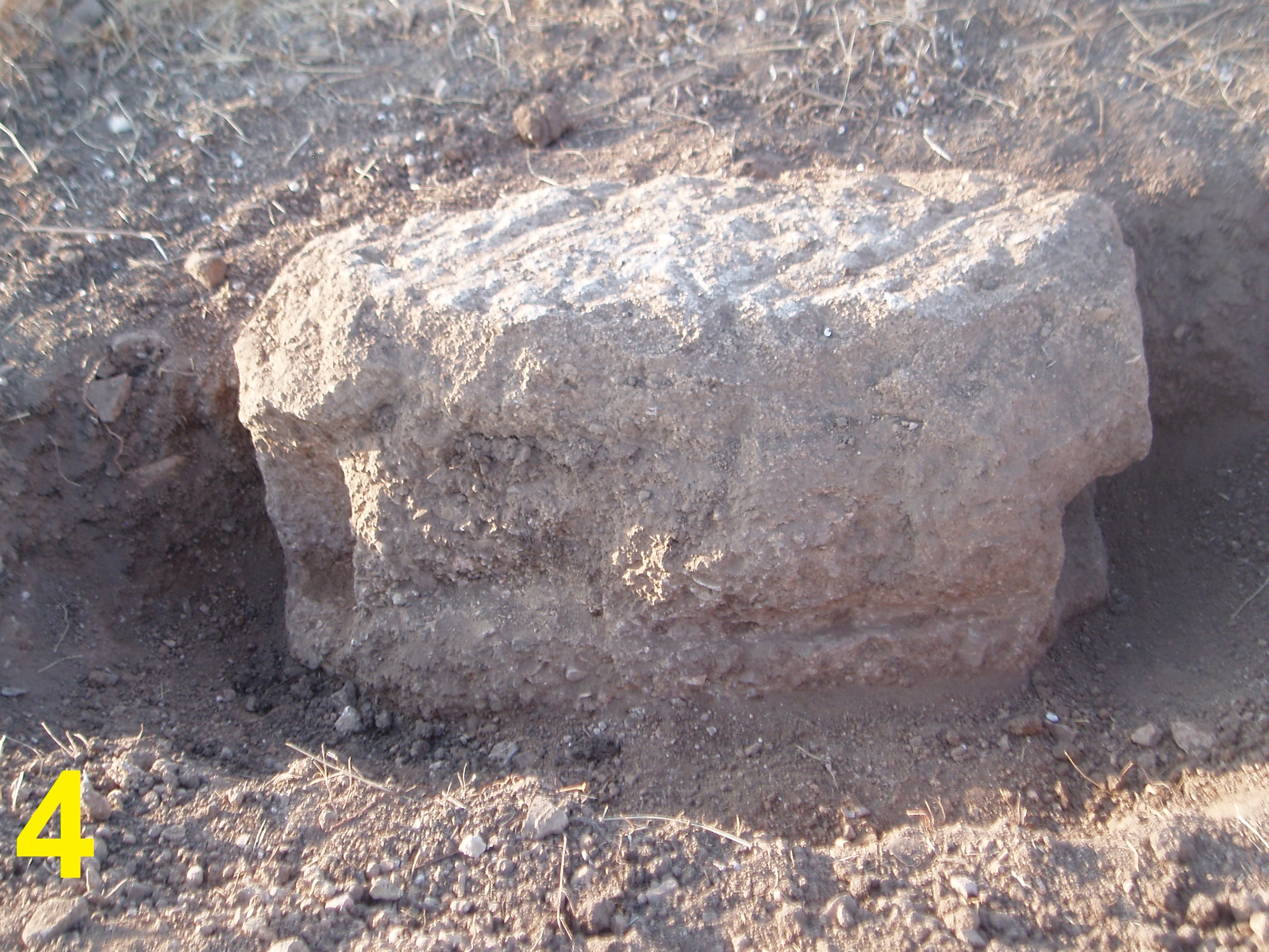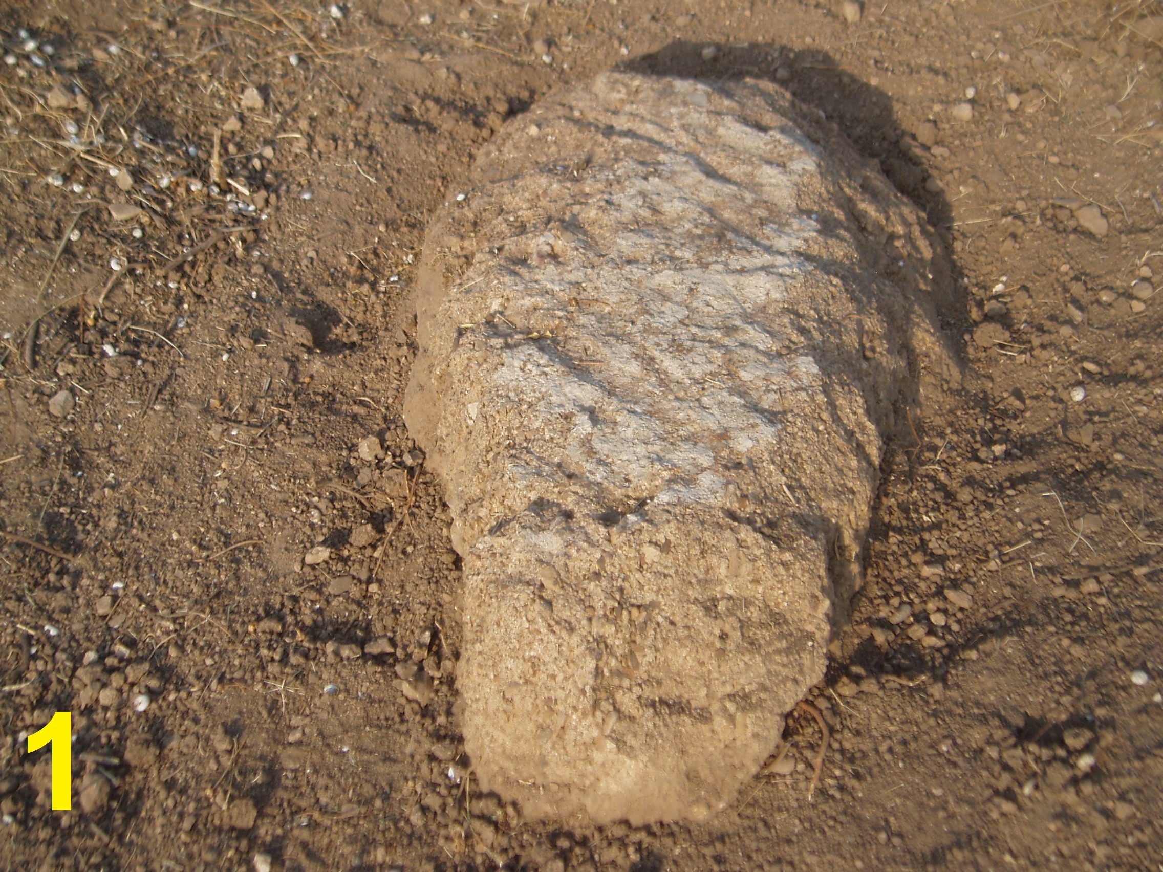الصورة 1 : الحجر كما وجد مردوما نصفيا في التراب طوله 1,20 و عرضه 70 صم اتجاهه شرق/غرب