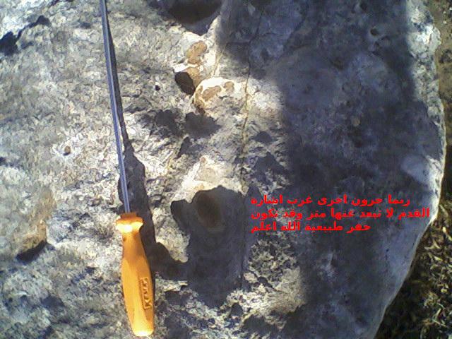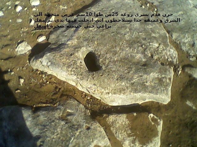 امام هذه الاشارات بدورها على بعد 20 متر 50 متر باتجاه الغرب عثرت على صخرة كبيرة عليها جرن طول 11سم وعرض 7سم وعمق 6سم