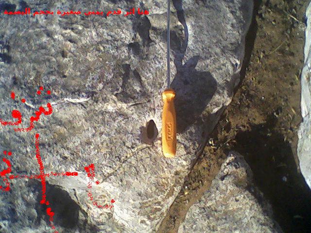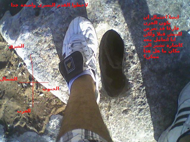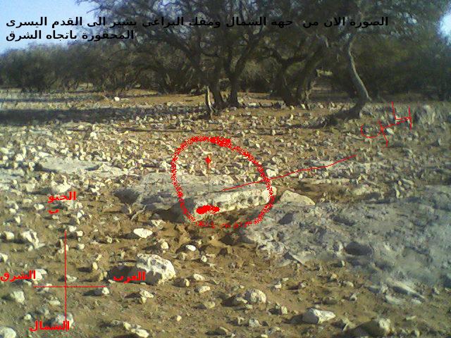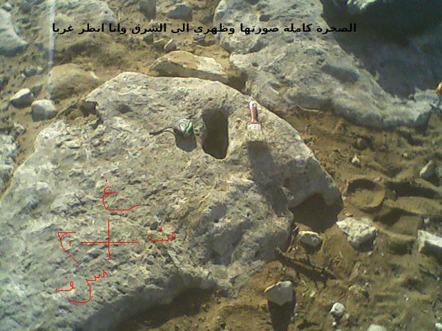 امام هذه الصخرة بحوالي 4الى 5 امتارعثرت على اشارة جرن يتوسط قدم يمنى تنظر الى الشمال وقدم يسرى تنظر باتجاه الغرب