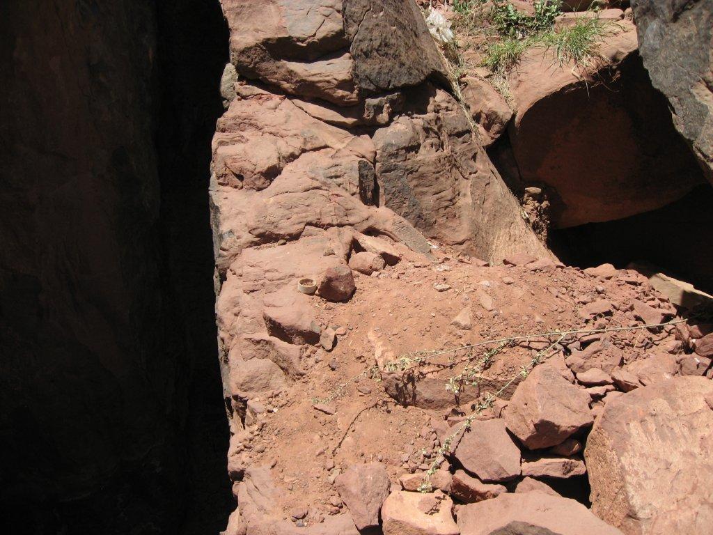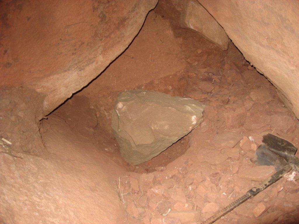مع العلم اننا قد قمنا بعملية الحفر بحدود 70 سم عمق قبل ان يشير الاخ صباحو الي وجود مغر ثم توقفنا خشية انهيار الصخور و الصخرة الموجودة في الحفرة في الصورة رقم 14 هي صخرة ساقطة من الاعلي و ليست من مكان الحفر