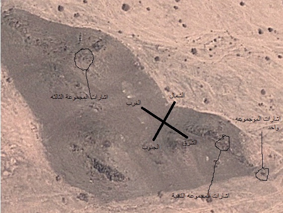 أخي العزيز بارك الله فيك ورزقك اترك كل الصور ونستمتع بالاشارة هذي فقط أخي لم يكن فتحت الهلال للشرق والظهر للغرب فلا شأن لي فيها ووضعت لك مقسات للهلال والتي مشترك ستجد مفتاح او مسمار او + وانظر للصورة وأذهب للمكان اذا شاهدت كل شيء بما قلته صحيح لك مني ان اضعك على الهدف بدون عناء ان شاء الله راقب المكان وابحث عن رجم كبييييييير غرب المنطقة لمسافة 112 متر ياتي على مجرى المياة وربي يرزقك