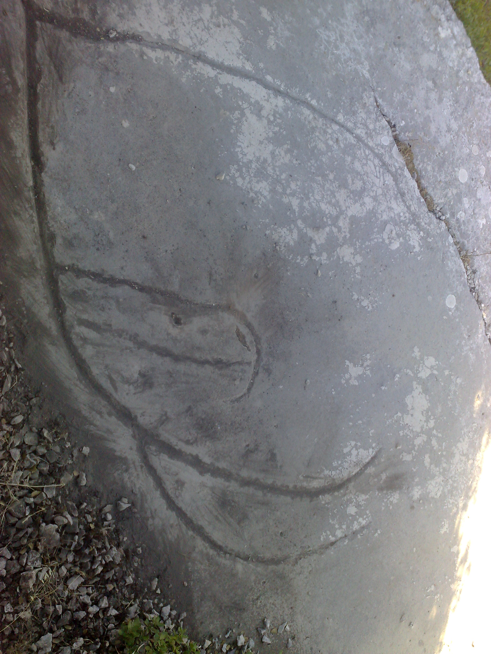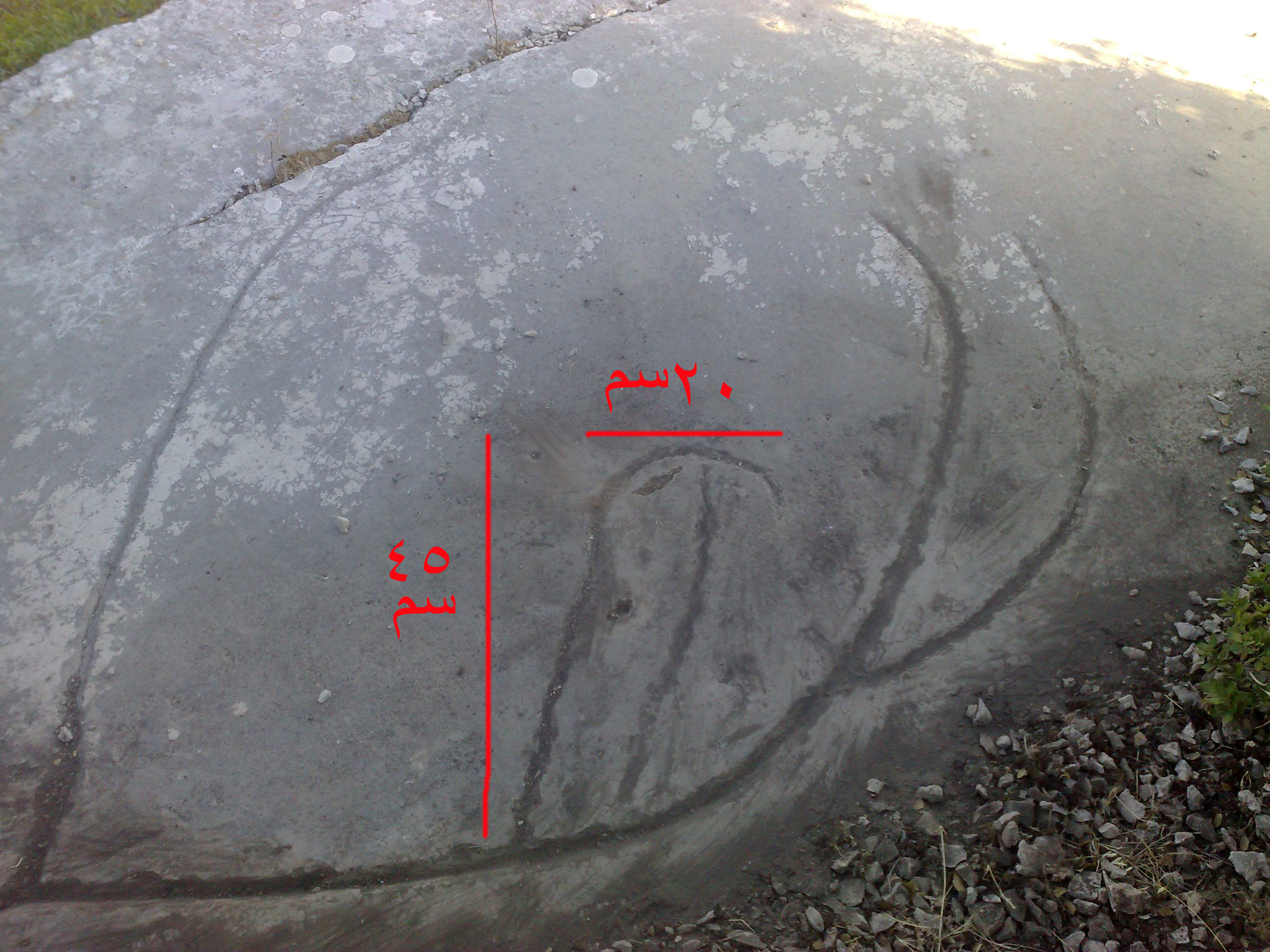 لقد وجدت هذا الحفر على صخرة افقية بالنسبة للارض وحولها اشجار كثيفة لم استطع ان التقط افضل من هذه الصور الرسم كبير اذ يبلغ طوله 2 متر وعرضه 1 متر ... الصورة التي فيها صخور هي بمحاذاة الصخرة التي حفر عليها