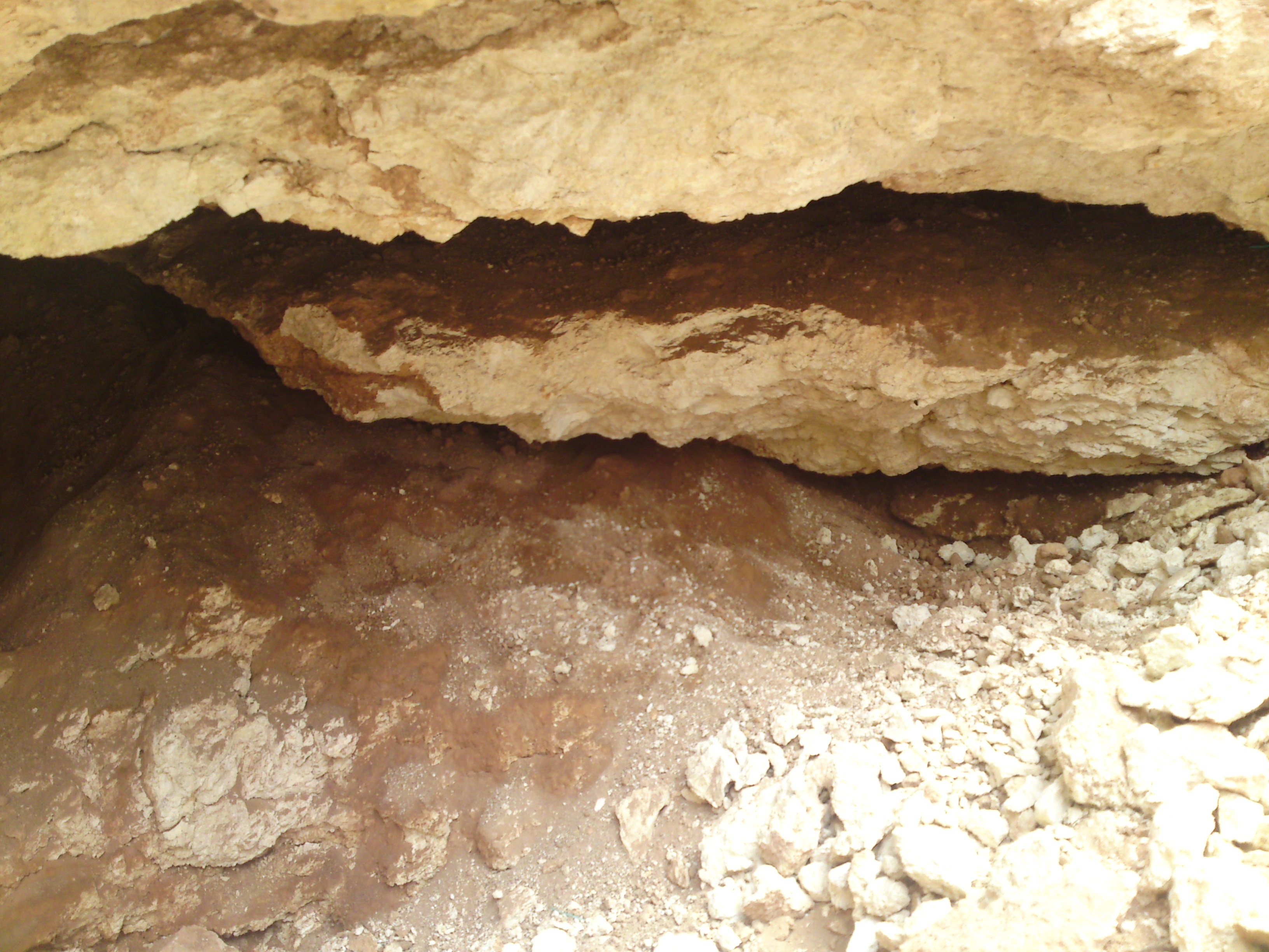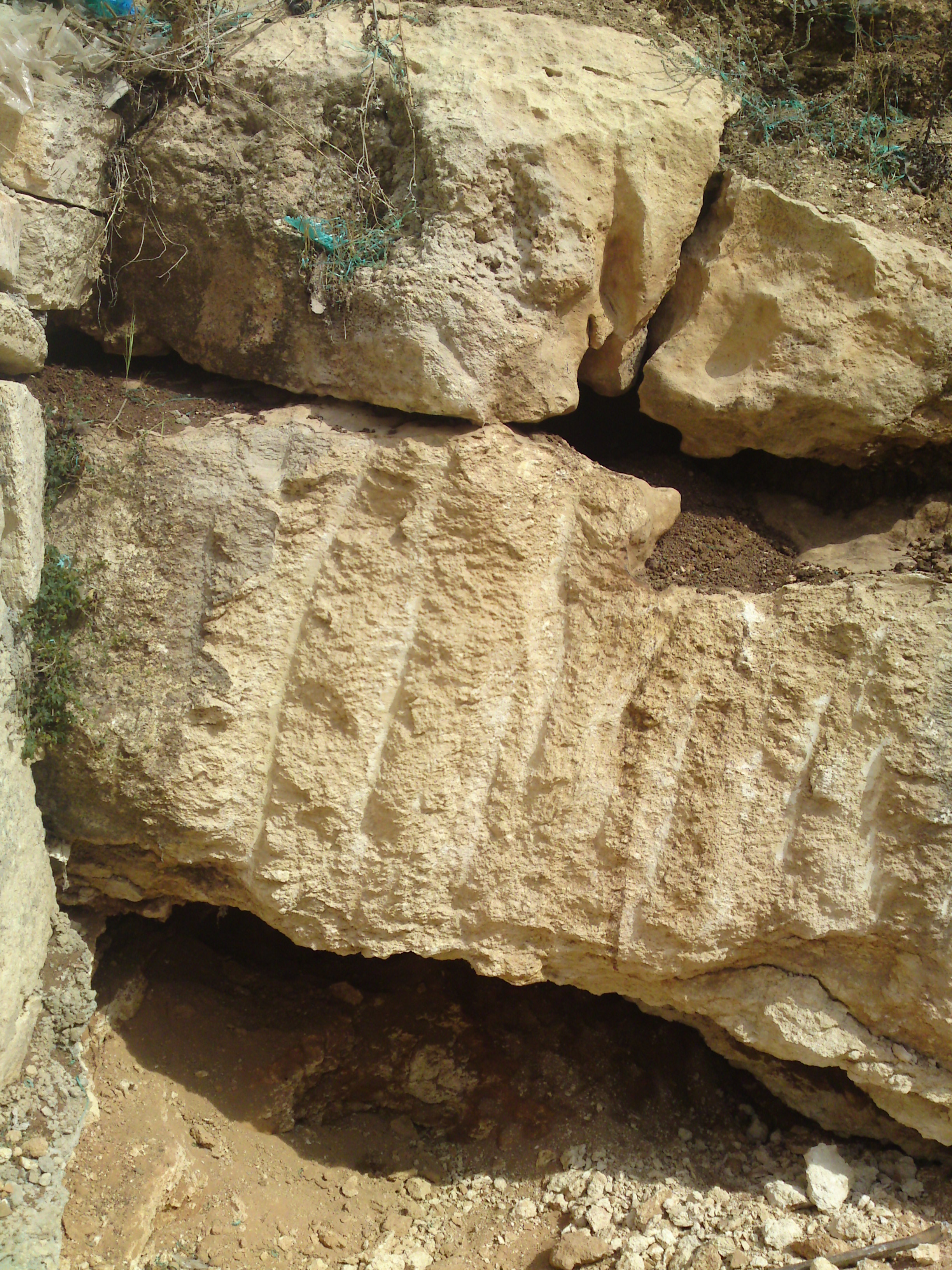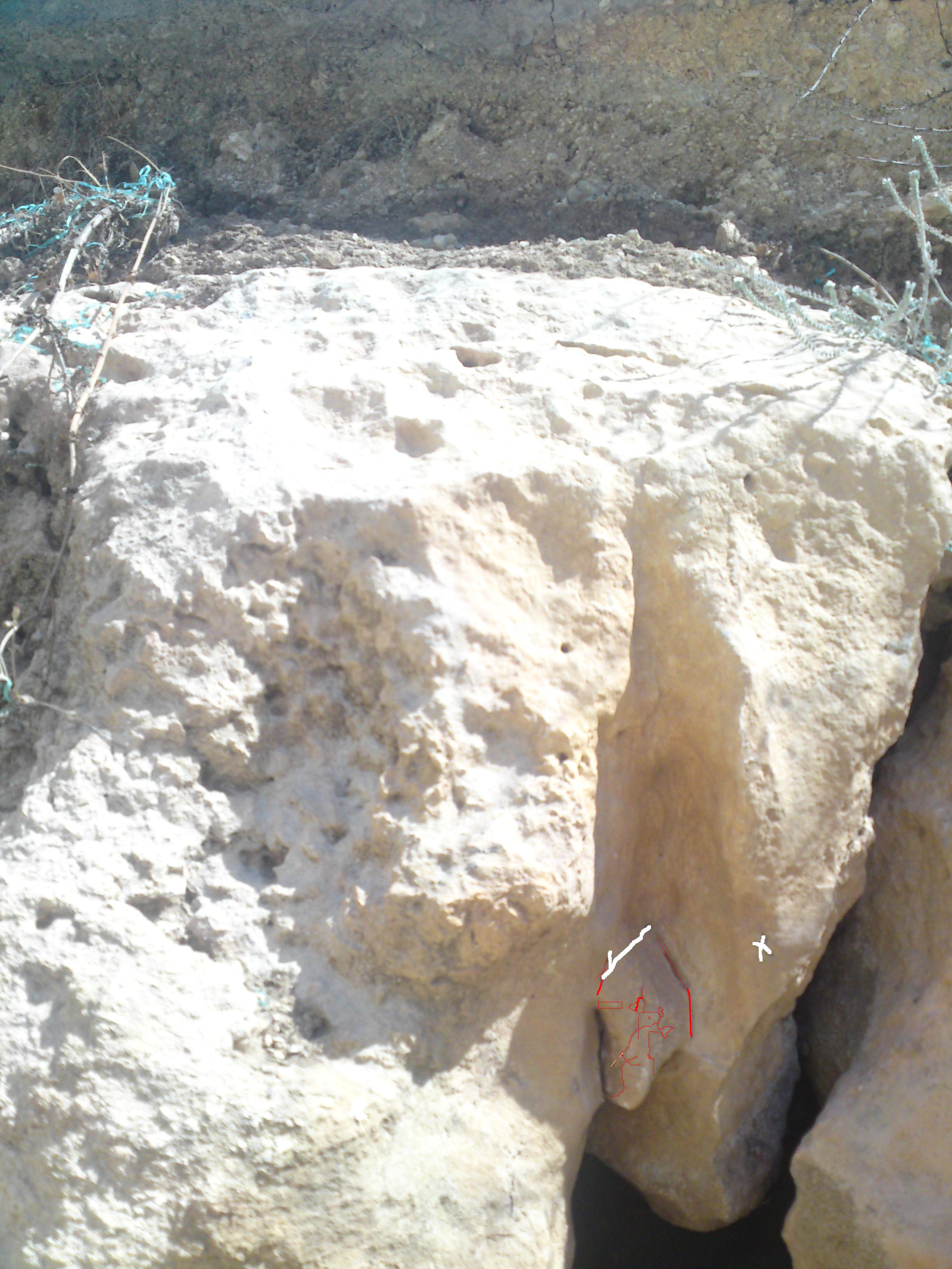 صخرة كبيرة منحوته وتحتها جرن كبير وتحتها مغارة مطمورة بتربه حمراء وبعدها صخور بيضاء