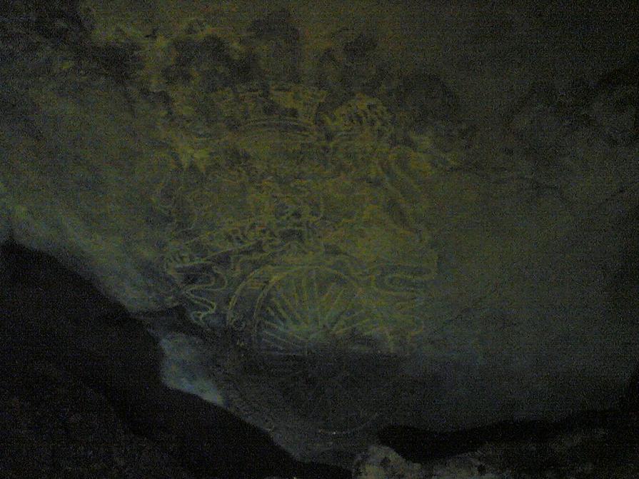 في طاحونة قديمة في سقف الطاحونة يوجد رسمة اسدين متقابلات على تاج ويوجد تحت التاج حجر دائري يوجد عليه هذه الكتابات