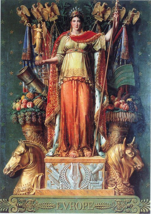 وتتابع الأسطورة أن زيوس كبير آلهة الأولمب في بلاد الإغريق ، علم بجمال وكمال الأميرة السورية الفينيقية أوربا ، إذ رآها ذات مرة من جبل الأولمب ، ووقع في شباك حسنها وجمالها ، فجاءها على هيئة ثور وكانت تلعب مع وصيفاتها على شواطئ البحرالمتوسط ، فأغراها ودفعها إلى إمتطاء ظهره وعبر بها عباب البحر,