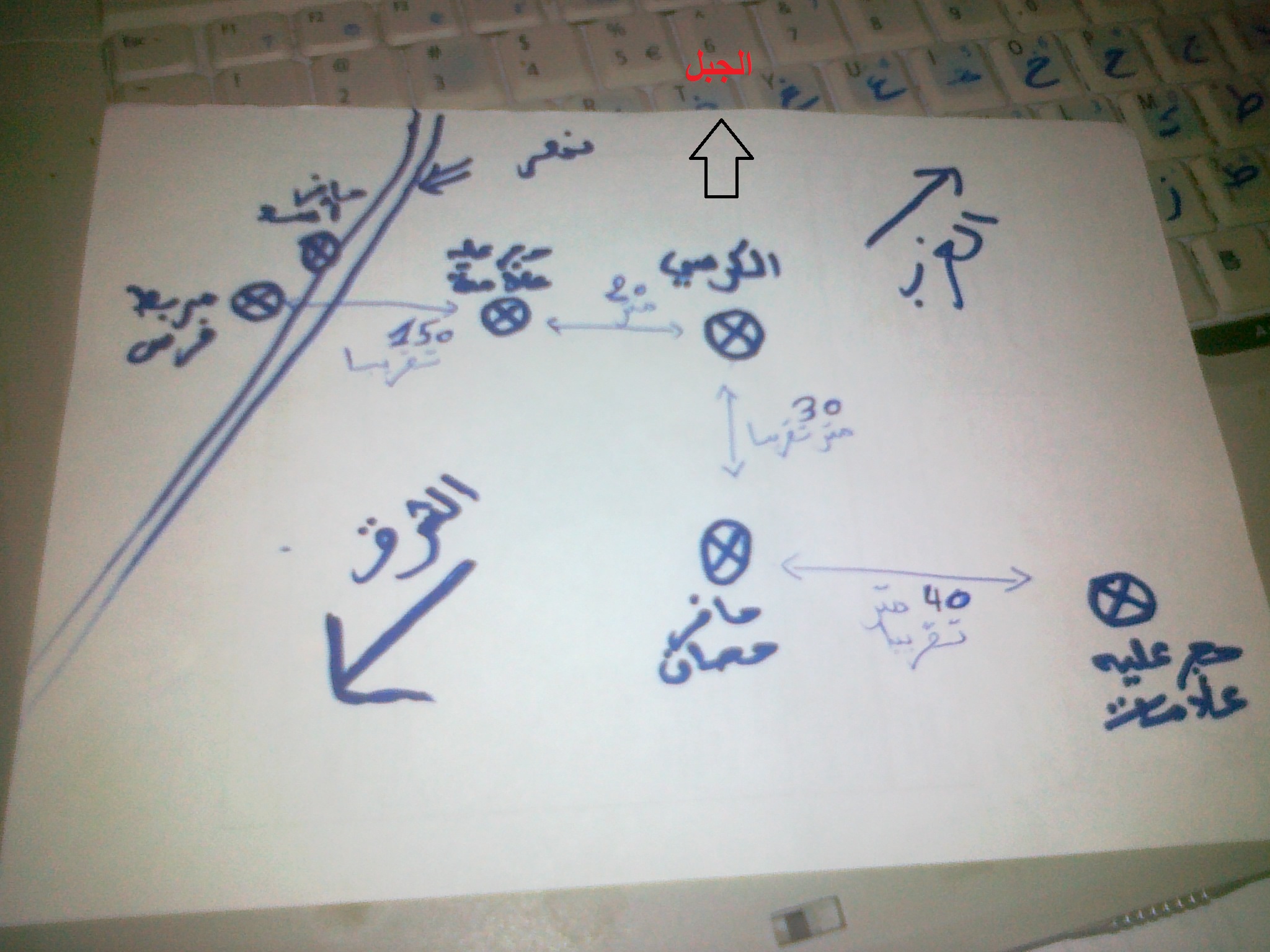الكرسي في اتجاه الجبل وهو يبعد حوالي 150 متر وعند البحث في سفح الجبل وجدنا ما نعتقد انها اشارة سارفقها قريبا
