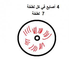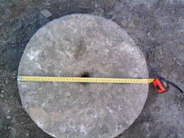 (نصف السفلي لرحى فقط) لما ازلتها وجدت تراب مخالف لكل انواع تراب المزالة. اكملت الحفر حتى وصلت الى الطبقة العادية على عمق 1 متر.اما في ما يخص الحجر فعندما قلبته وجدت فيه اثار خطوط اصابع اليد تحيط بشكل دائري على تقب الرحى. نظرا للتلف تلك الاثار بفعل عامل ماء المطر ساكتفي برسم توضيحي فقط.