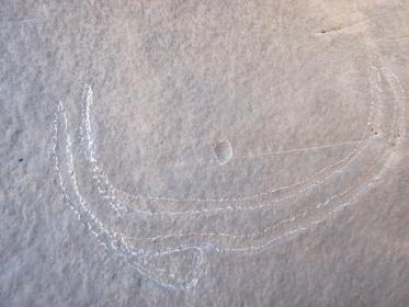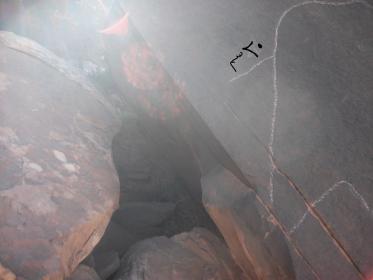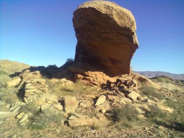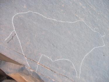 وجدنا صورة الثور هي الاولى (طوله من الرأس الى الذيل 153سم ) ينظر باتجاه الصخرة ( الصورة الاخيرة )التى تبعد حوالي 1.5 كلم شرقا ... و طول ذيله ( 20 سم ) يشير الى الرسم الذي يشبه هلال و به بصمة ( المسافة بين البصمة و الخط الداخلي 06سم )...و الصورة الاخيرة هي لكهف بنيت عليه جدران و تحت السقف ( المغارة ) يوجد جرن مخروطي يتجه الى الارض ( طوله 06 سم و قطره 05 سم ) و عندما حفرنا باستعمال الاسياخ تتبدل الاشارة من مكان الى آخر .و شكرا .