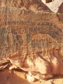 نقيس حيوان نحفر منزل راسه تحت فوق رقبته حرف قريب من حرف T بس اطارف الحرف من فوق نازله تحت مع الجهتين .وفوق راسه علامه . شخص رافع يدينه . ذيله نازل الا تحت وفوق ذيله حفرتين صغار جمب بعض .وخلفه شخصين واحد رافع يدينه وله اصابع والثاني منزل يدينه وله اصابع والشخص الاول الي عند راسه ماله اصابع .