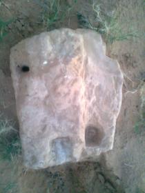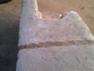 احد جوانب الحجر غير مكتمل أو محطم (كما وجد) و الجانب الأيسر مكتمل .. ينتههي من الأعلى بزاوية حادة .. كالسهم يعلوها جرن مربع / مستطيل مفتوح (لم آخذ القياسات)