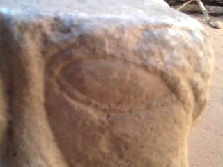 1- حجر الوجه : حجرمتوازي المستطيلات (70 سم *30سم *30سم) .. منحوت على شكل وجه مع لحية .. عينان نفر .. انف نفر .. فم مقوّس مفتوح محفور بشكل سيال عريض يشق الحجر طوليا