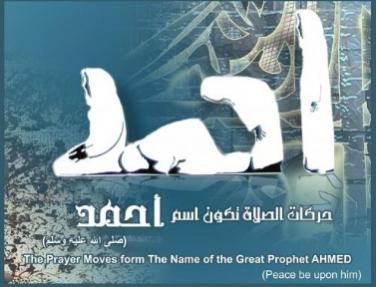 أنظر من خلال الصورة إلى إسم أحمد ستجد حقا أن الأمر غريب فعلا ، إن كل حركات الصلاة تشكل عبارة أحمد ومن ثم لاحظ فإنها مرتبة بداية من الوقوف إلى الركوع فالسجود فجلوس الإستراحة أو التشهد ،، ولاحظ مثلا بأنه يستحيل أن تجد مثل هذا التناسق العجيب حقا في الأديان الأخرى ، فأين أنتم يا من تكذبون بوجود نبينا الخاتم حقا إنه فخر لنا أن نكون نسبا لهذا الدين ...