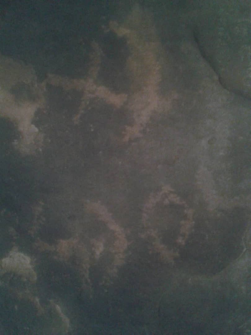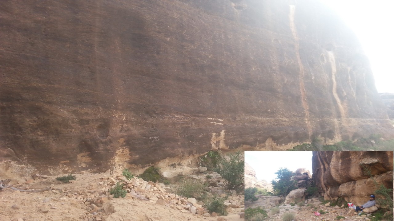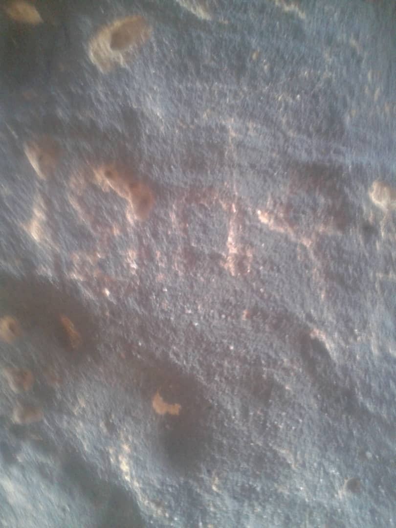 - رموز من تجويف او ما يشبه السرداب عرضة متر ونصف وإرتفاعة مترين يبدو كأنه ممر هوائي لان الرياح فيه شديدة وهو اعلى الصخرتين الموضحات خلف الصخرة الامامية