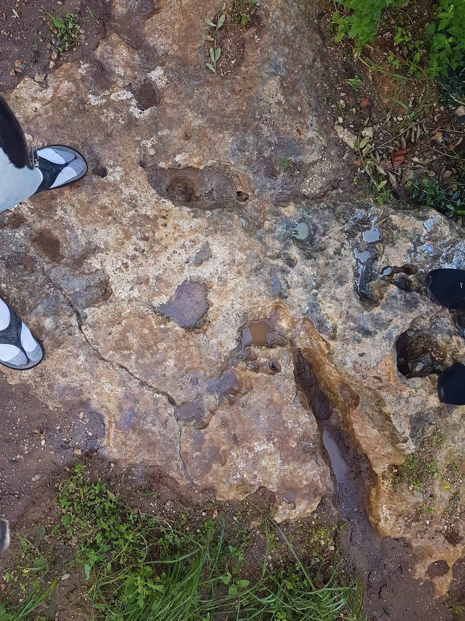 الصخرة تقول ان عليها اشارة تشبه القدم طولها 27 سم وعرضها متفاوت وسطيا 12سم وفي بطنها جرن قياسه حوالي 8سم قطر و6سم عمق واخر الدعسة جرن صغير بداخله جرنين صغيرين