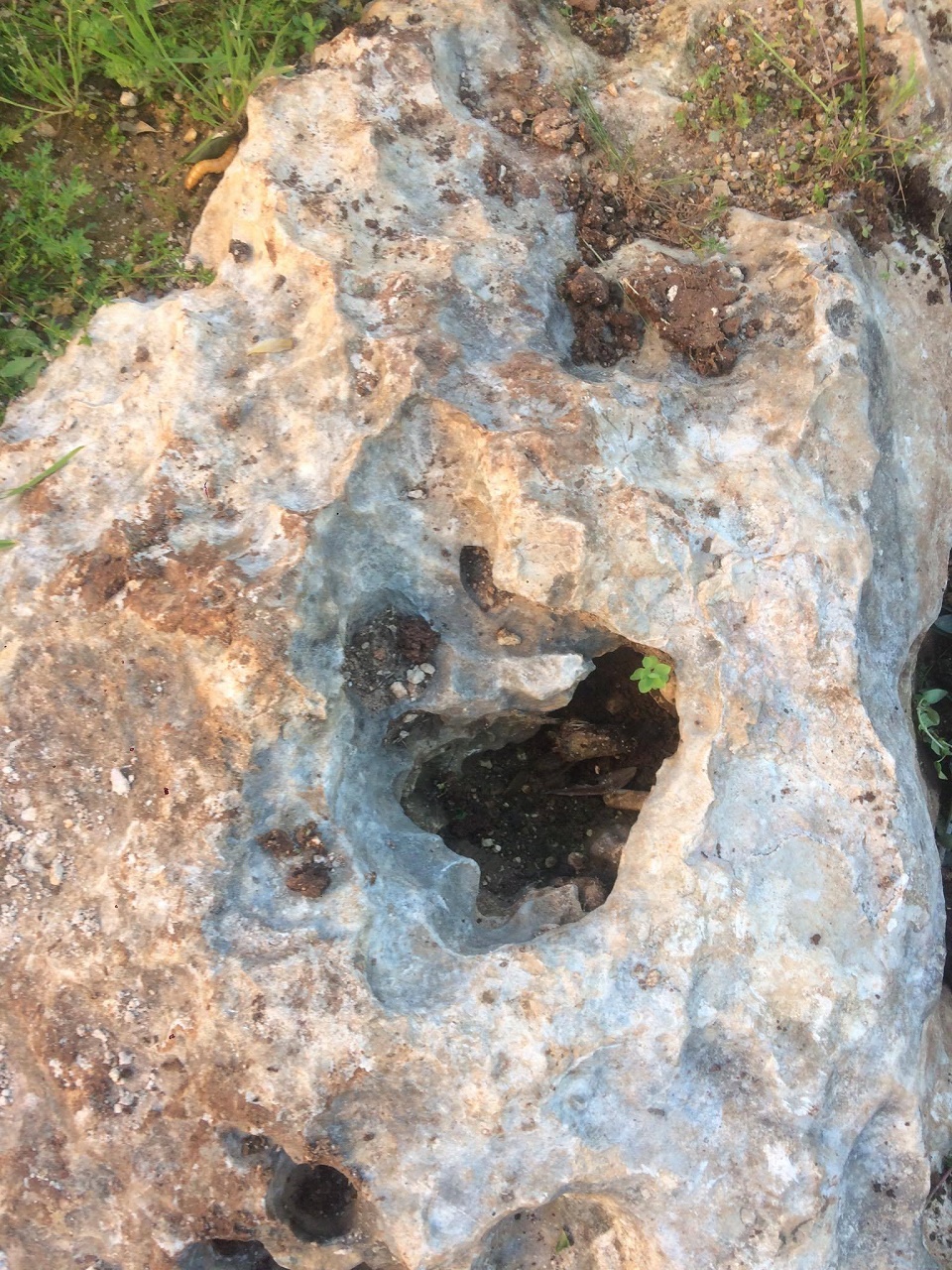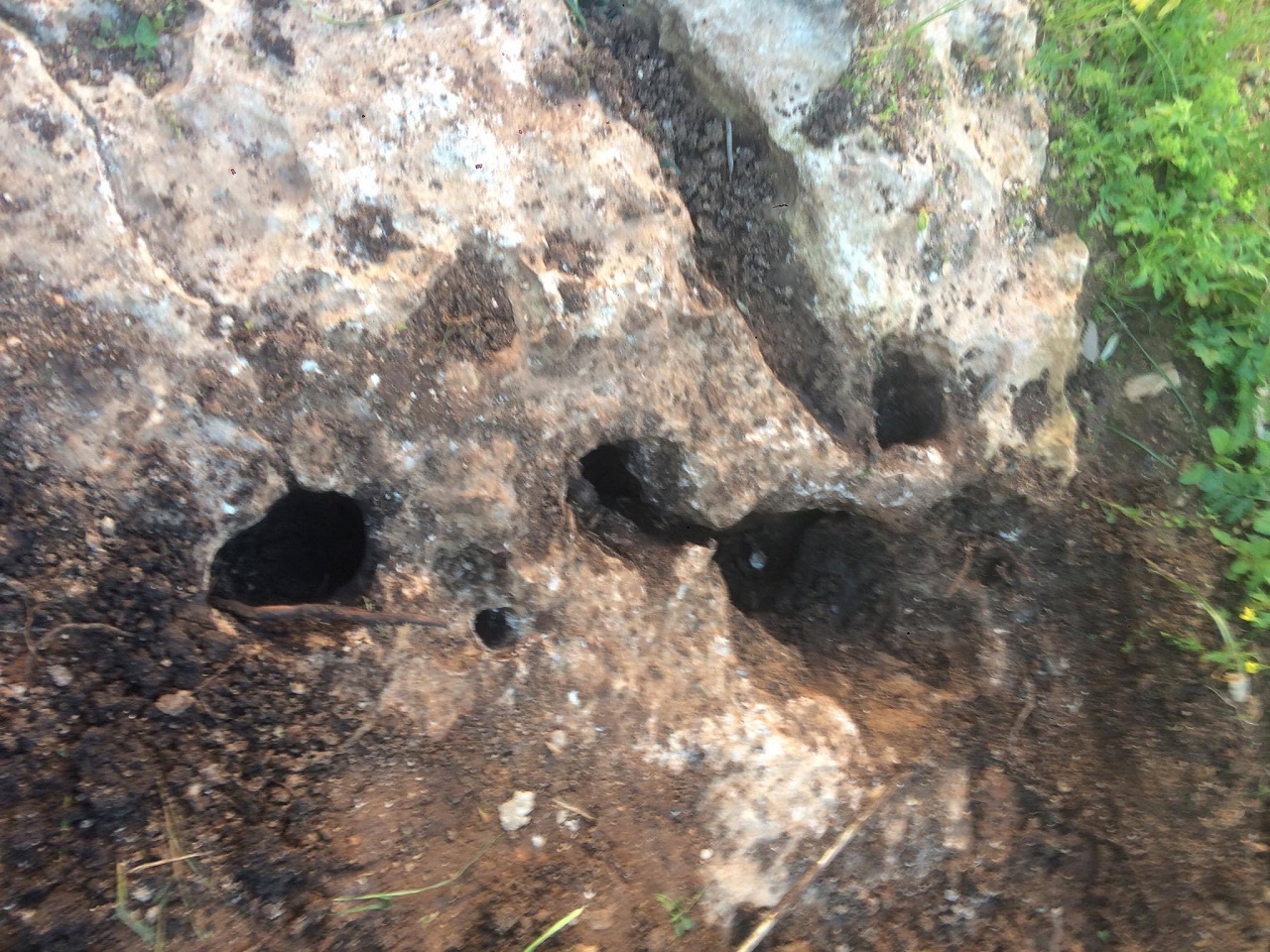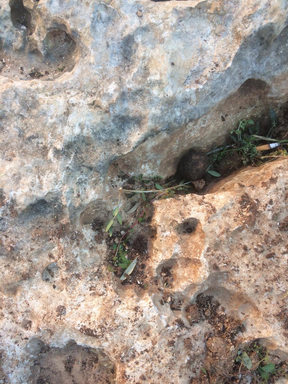 على بعد اقل من خمسين متر شمالا جميع انواع القص الصخري ضخم وصغير ومتوسط ... علامات بالصخور من سيالات وجرون عادية وجؤون مخروطية وشجرة زيتون مجوفة داخل تجويفها رجم حفرنا تحته فوجدنا فخار مكسور ثم صخر لذاك لم نكمل