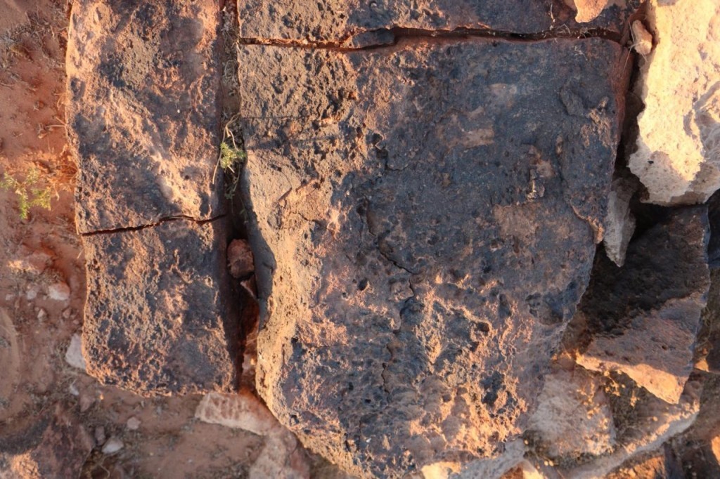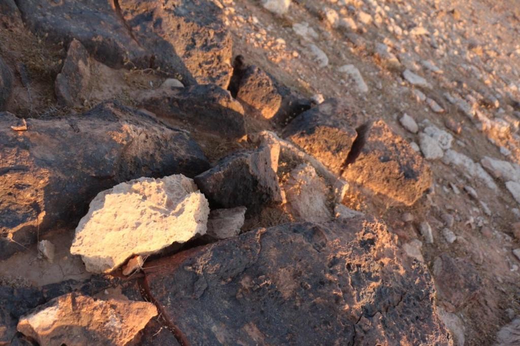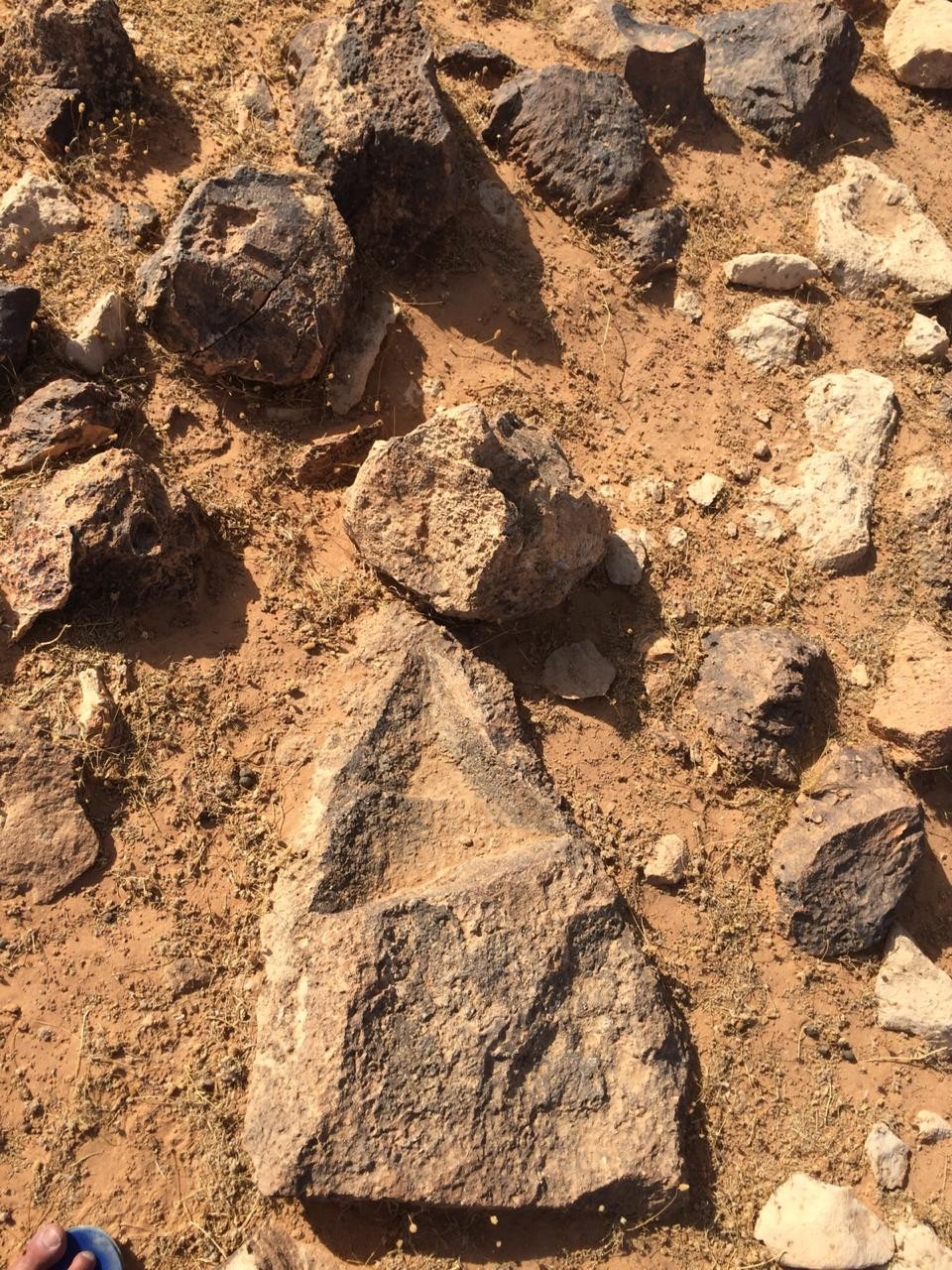 يوجد حجر أبيض خلف صخرة المثلث بمتر تقريباً صغير الحجم عليه جرن فايش بعده مباشرة بمتر تقريباً يوجد حلقة أحجار بيضاء بشكل دائرة يتوسطها حجرين لون أبيض .