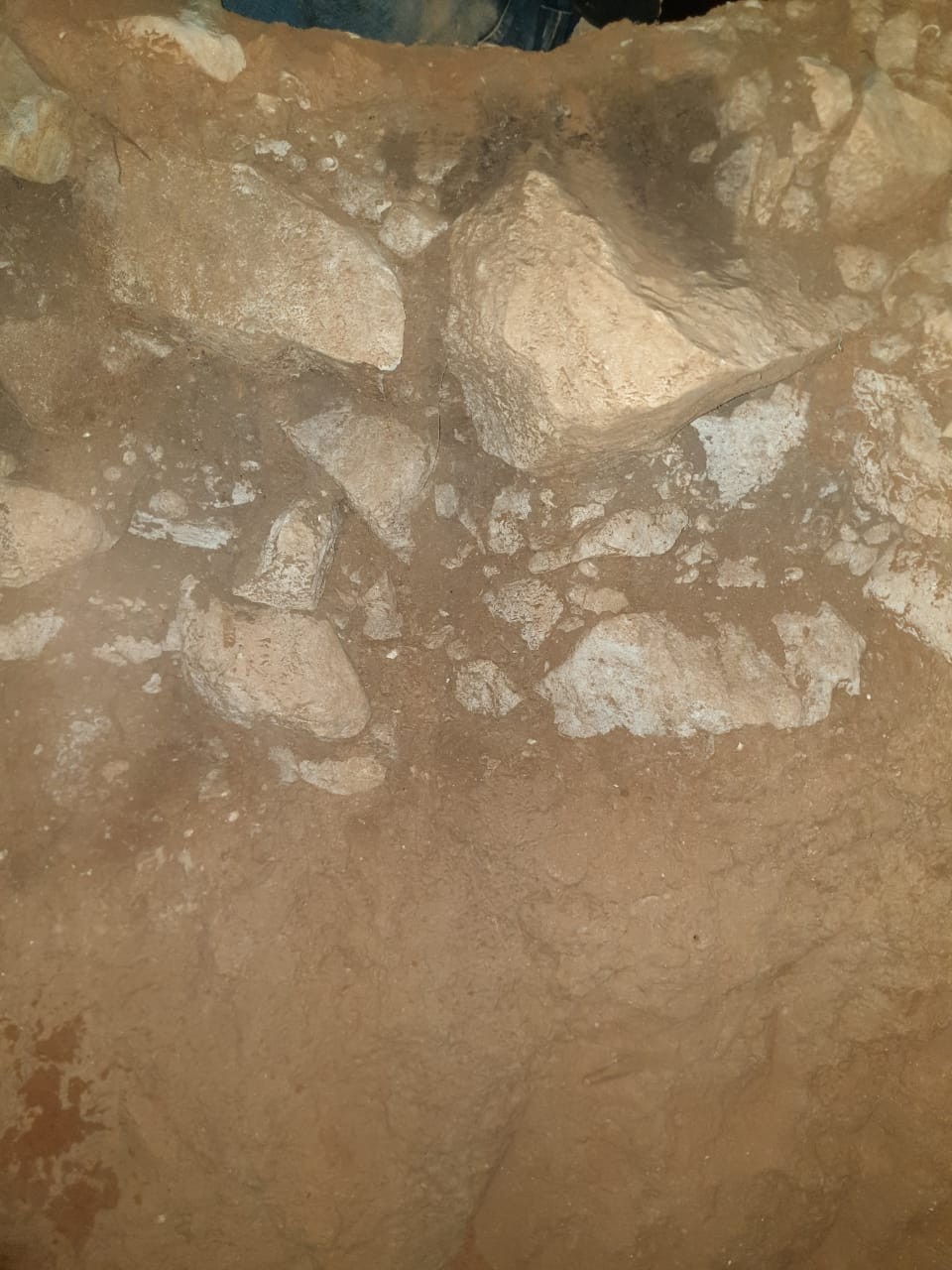 واصلوا الحفر حتى الصخرة التي في الصورة. عندها دققوا النظر فلاحضوا ان هناك شق في الصخرة تم ملؤه بالطين مخلوط بقوقعة الحلزون. فتتبعوا الشق الى ان حددوا شكل المثلث و الجرون.