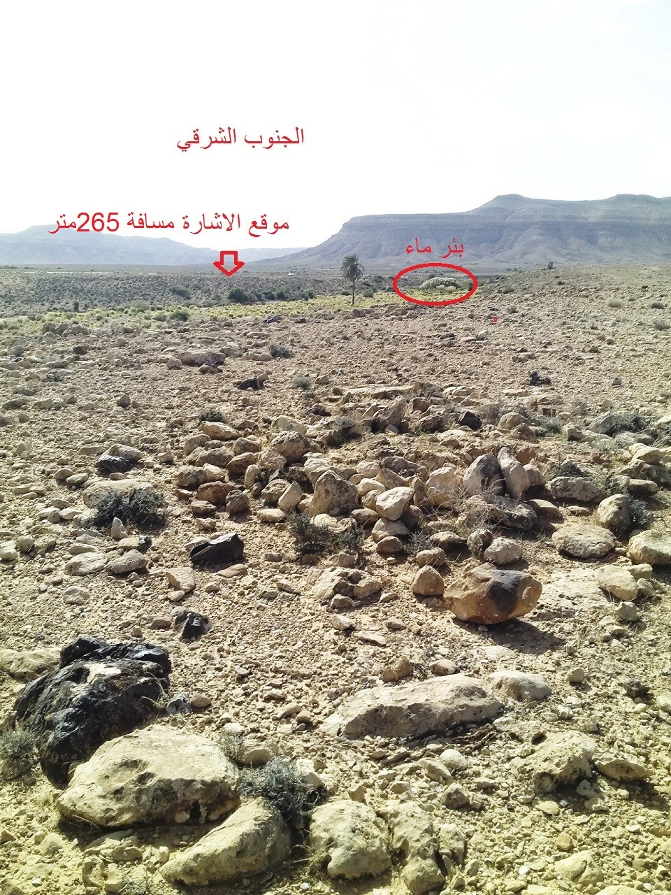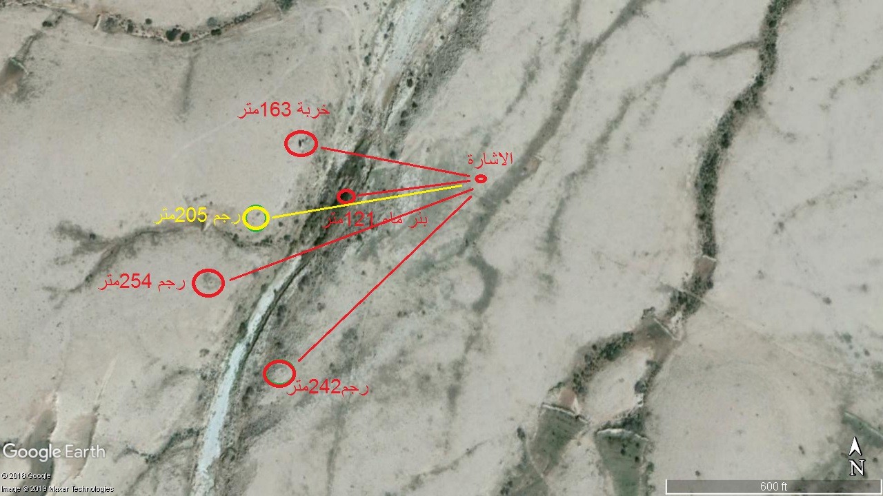 يوجد غرب الاشارة خربة وبئر ماء والجهة الجنوبية الغربية يوجد رجمان ومن جهة الجنوب تقريبا يوجد رجم يعتبر كبير نوعا ما ومن جهة الجنوب الشرقي يوجد رصف حجارة بشكل زاويا قائمة
