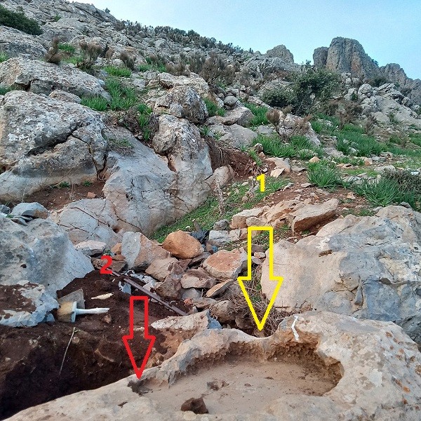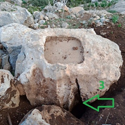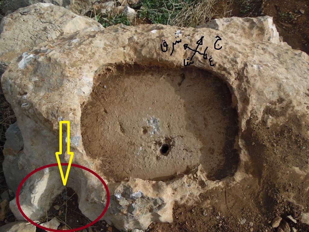 عبارة عن شطل تقريبا مربع غير منتظم بداخله سهم بكول 4سم متجه نحو الجنوب وخلفه كما نلاحظ ممربع صغير بطول 3سم /3سم وبعمق حوالي 30سم لم أستطع تنظيفه لأنه عميق وضيق