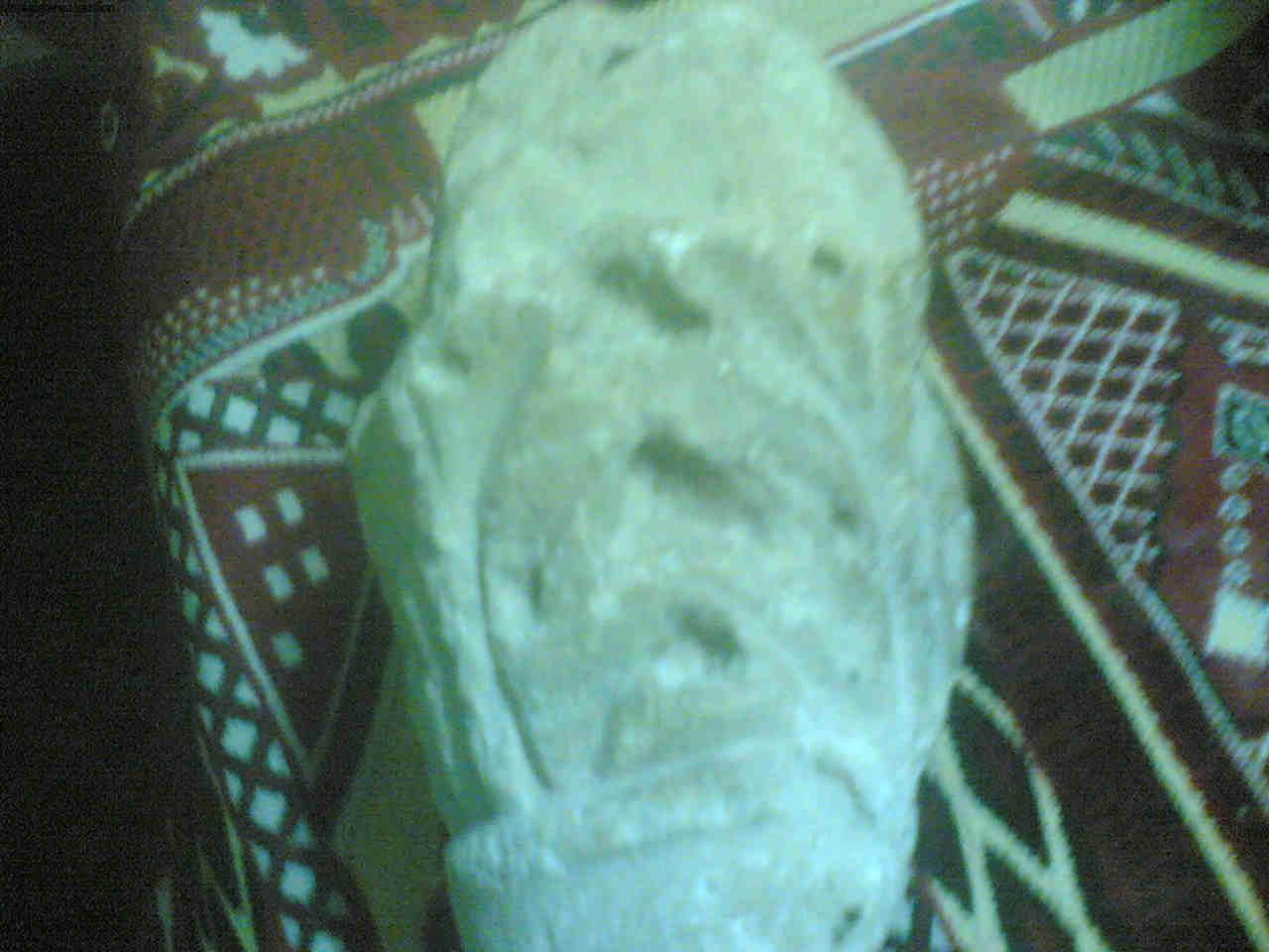 اشبه بفنجان بداخله حرف (لا ) وهي كما بالصوره رقم (3 ) وهو بطول 32 سم تم كسرة من باقي العمود لانه الكسر الجديد واضح وبداخله حبيبات مثل السكر الناعم . ((للتنويه تم تكسير هذا العمود من والدي الذي كان رافض للحفر كوننا حفرنا اكثر من مرة واراد احد الشيوخ ان يحفر داخل المنزل فقام على هذا العمود وكسرة امام الموجدين )) والان لنعود للحفر بعد عثورنا للعمود وعمل تغيرات في بناء المنزل تم ردم الحفرة الامتصاصية والتي هي من البداية لم تكن كبيرة وانما كانت لمياه المطبخ واحد الاقاريب لي احضر شيخ وحفرنا مكان ما وجد والدي استخرج العمود الا اننا لم نعثر ولم نجد اي شىء من الاعمده والتي يقول والدي بانها كانت متشعبة واكثر من واحد و كما اذكر احضرنا شيخا اخر او هو بالاحرى ليس بالشيخ بل احد الدراويش ويحمل مسبحه فقال ان هذا العمود له باقي قد يزيد عن 60 سم وعلية نقوش يوجد على بلاطه لايوجد عليها رسومات وقال انهم يخفونه ويحركونه ( الرصد ) واننا لو بقينا نحفر لن نجد شيء وقد قمنا بعدها بحفر حفرة اخرى لا تبعد الاولى 3 متر عثرنا على عمق تقريبا 2.5 ما هو موجود بالصور 1 و 2 و 4 وهيي بالصورة رقم 2 عبارة عن عمود بقطر 20 سم علية الرسمة التي تشاهدونها من الجهات الاربعة وهي عبارة مثلثين ودائرة اما الصورة رقم (1 ) فهي جزء من تاجية بحجم اكبر عليها نفس الرسمة الموجوده بالصورة (3 )